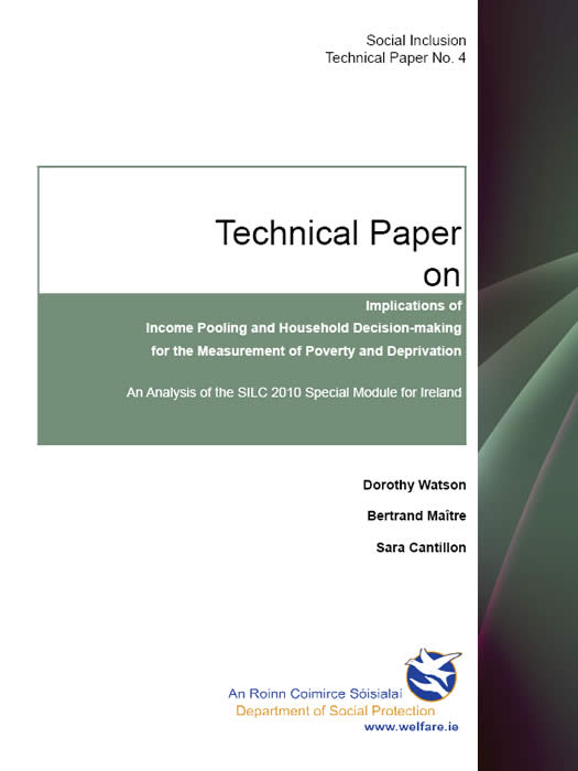 An Analysis of the SILC 2010 Special Module for Ireland :A technical paper on Implications of income pooling and household decision-making for the measurement of poverty and deprivation has been published online today. The technical paper focuses on the core assumption in conventional poverty measurement that income is shared within households to the benefit of all household members. It draws on a special module in the 2010 Survey on Income and Living Conditions (SILC) to test this assumption. The paper examines aspects of the household’s financial regime, including which household members receive income, the extent to which income is contributed for the benefit of other household members and responsibility for financial decision-making. The technical paper is an output of the Department’s research programme with the Economic and Social Research Institute (ESRI) for the Analysis and Measurement of Poverty and Social Exclusion, under the National Action Plan for Social Inclusion 2007-2016 (NAPinclusion). The authors are Dorothy Watson and Bertrand Maitre of the ESRI, and Sara Cantillon of UCD.
